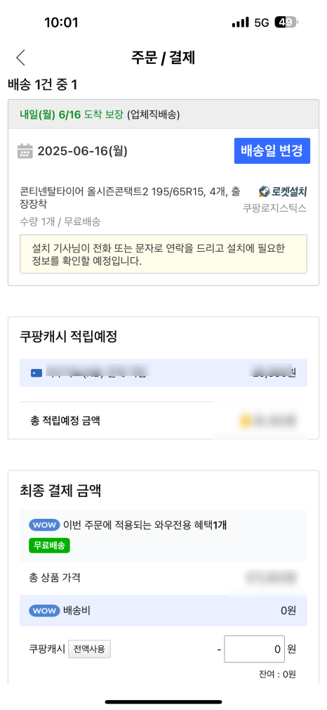 쿠팡 타이어 설치당일,