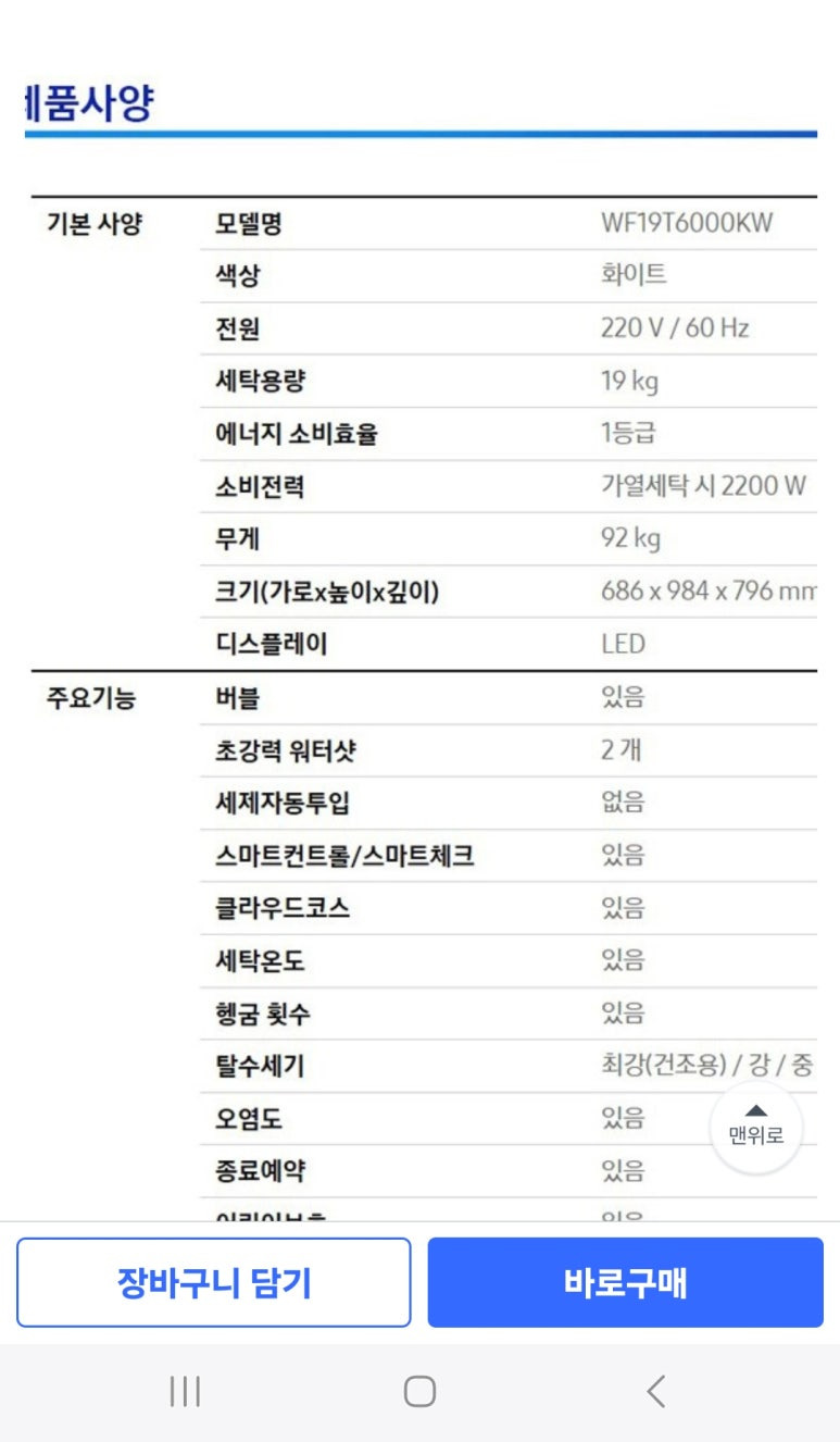 구매후기도 5천건이 넘었는데 후기도 전체적으로 평이 좋아서 WF19T6000KW 삼성드럼세탁기로 주문하게 되었다